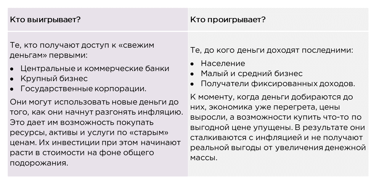 Те, кто оказался ближе к источнику новых денег, успевают зафиксировать рост капитала еще до того, как инфляция проявит себя в остальной экономике