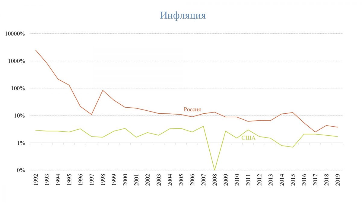 Современная Россия начала свою историю с четырехзначной инфляции. В 1992 году она составляла 2509%. К началу нулевых ее удалось замедлить до двухзначных значений, но все равно до 2016 года инфляция в стране оставалась высокой. С 2016 года началась новая эра, когда инфляция приблизилась к уровню США, а иногда даже совпадала с ним.
