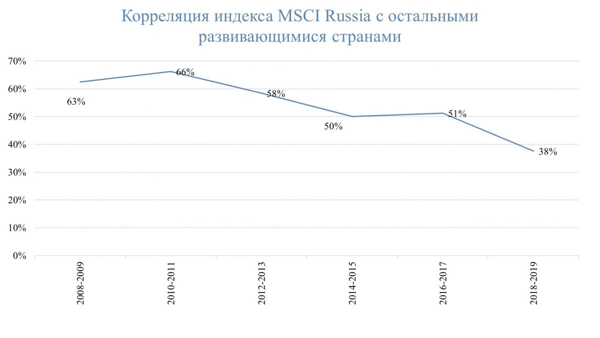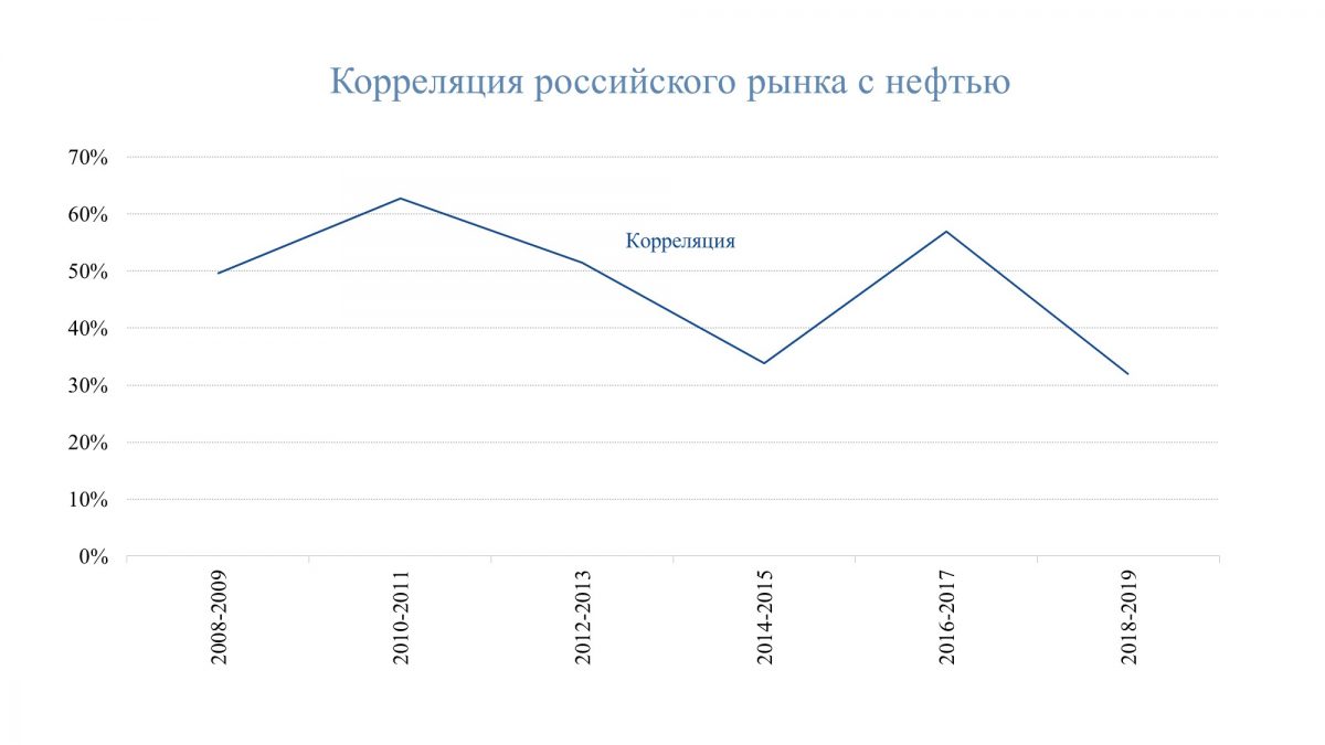 Сложившийся стереотип о России подразумевает сильную зависимость экономики от нефти. Так оно и было в период с 2008 по 2011 годы, но с тех пор корреляция российского рынка с нефтью заметно уменьшилась.