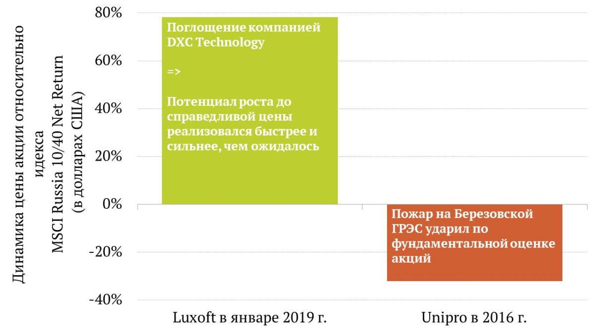 - Юнипро в 2016 году – пример того, когда неудача ухудшила динамику стоимости акций компании. В том году в фонде BNP Paribas Russia Equity была позиция в акциях этой компании (специализируется на электро- и теплогенерации). Мы считали акции Юнипро привлекательными – по нашим оценкам, на тот момент акции обладали потенциалом роста до справедливой стоимости на уровне 20% и высокой ожидаемой дивидендной доходностью. Однако в феврале случился пожар на недавно построенной Березовской ГРЭС. В результате, в 2016 году рост стоимости акций компании отстал от рынка в целом на десятки процентов в долларовом выражении.