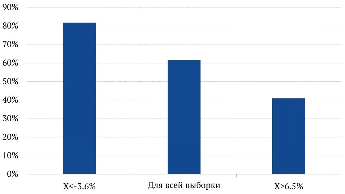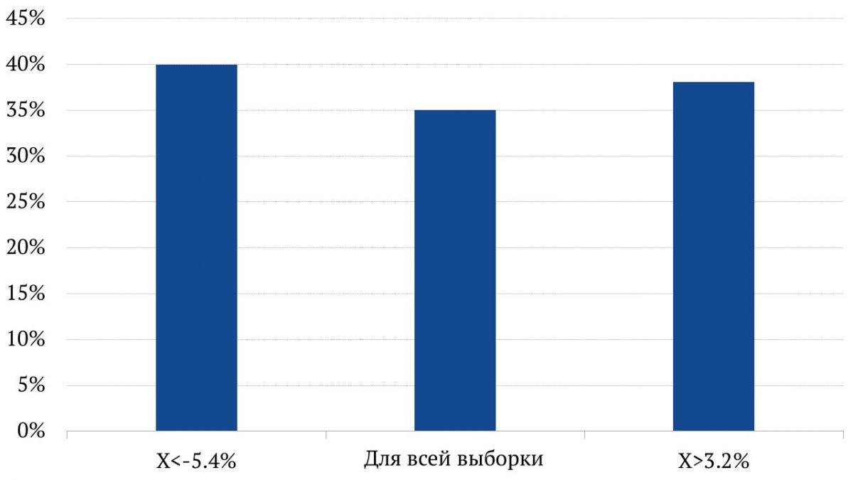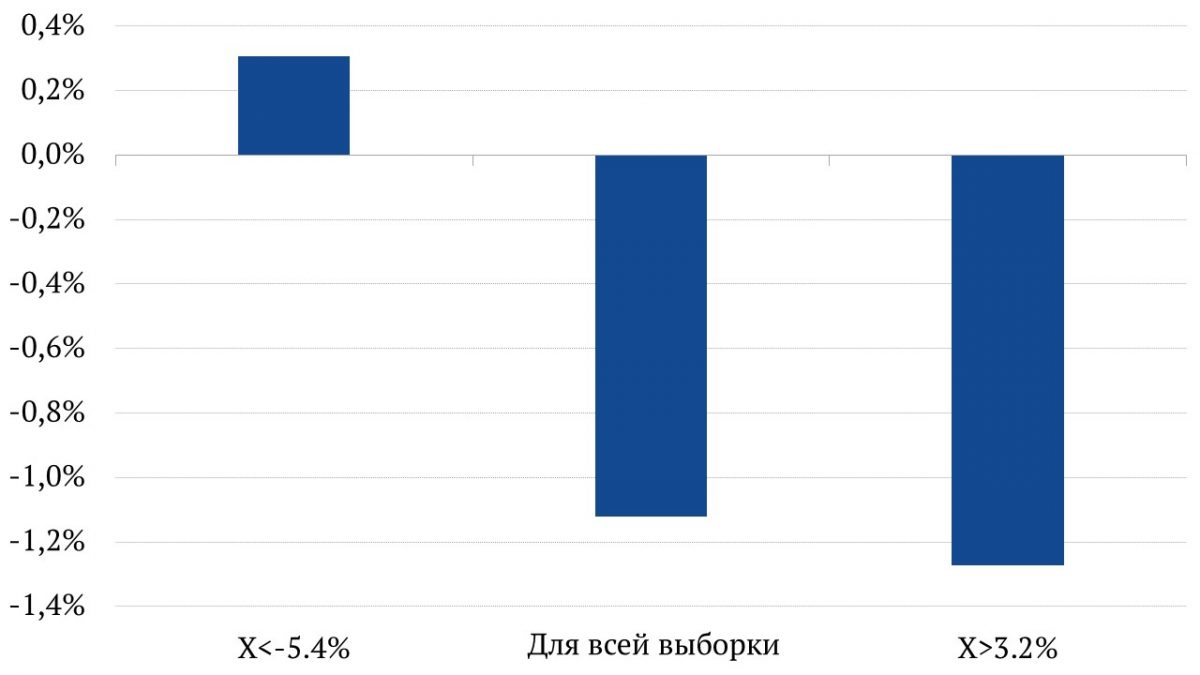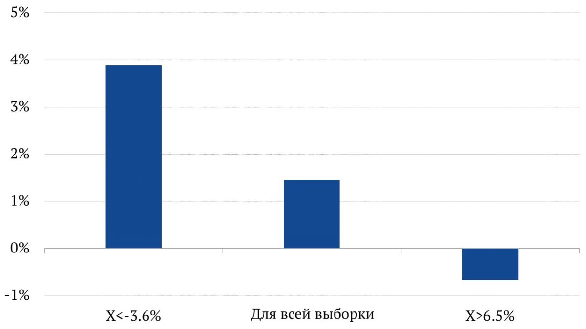 Средняя разница между средней доходностью для крупных фондов на российские акции и доходностью индекса MSCI Russia 10/40 Net Return на промежутке 12 месяцев в зависимости от того насколько такой показатель за предыдущие 12 месяцев отличался от среднего значения этого показателя за длительный период