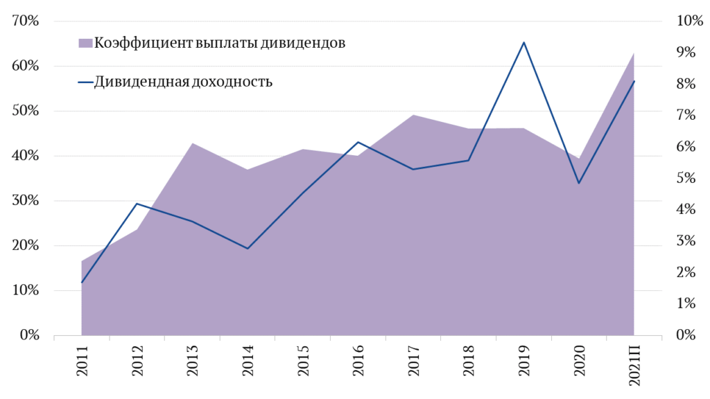 График 1. Коэффициент выплаты дивидендов и дивидендная доходность для индекса MSCI Russia 10/40