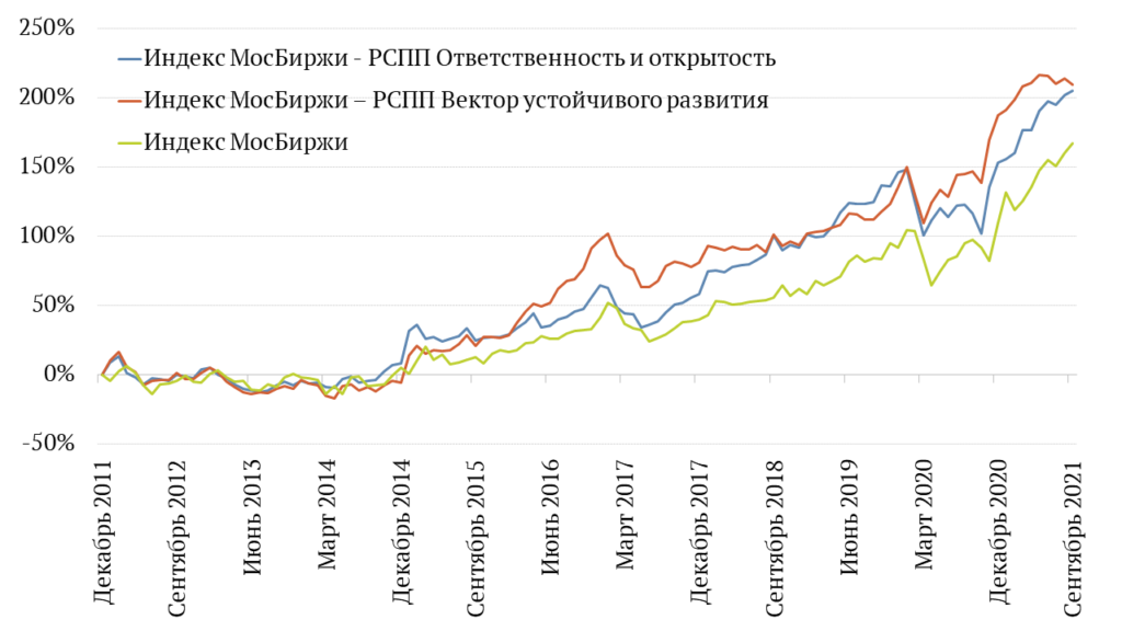 Кроме того, в апреле 2019 года Московская биржа запустила «Индекс МосБиржи – РСПП Ответственность и открытость», который включает 29 ведущих компаний с точки зрения раскрытия информации по ESG, и «Индекс МосБиржи – РСПП Вектор устойчивого развития», который включает 26 компаний, показавших наилучшую динамику в сфере устойчивого развития. Индексы были разработаны для оценки вклада организаций в устойчивое развитие и нацелены на продвижение ответственного бизнеса среди российских эмитентов, повышение их прозрачности и инвестиционной привлекательности.