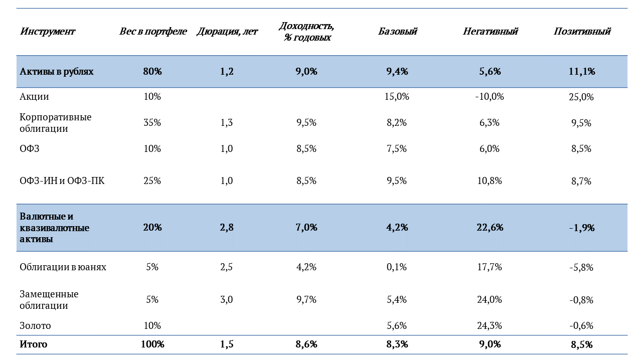 Тем не менее, принимая во внимание случившуюся девальвацию рубля и ожидания по нормализации курса в течение второго полугодия 2023 года, мы планируем сократить долю валютных и квазивалютных активов до 20% в портфеле в пользу рублевых активов. Планируем сократить позицию в золоте после роста, с доведением веса данного актива в портфеле до модельных 10%. Также намереваемся незначительно сократить вес замещающих облигаций и облигаций, номинированных в юанях.