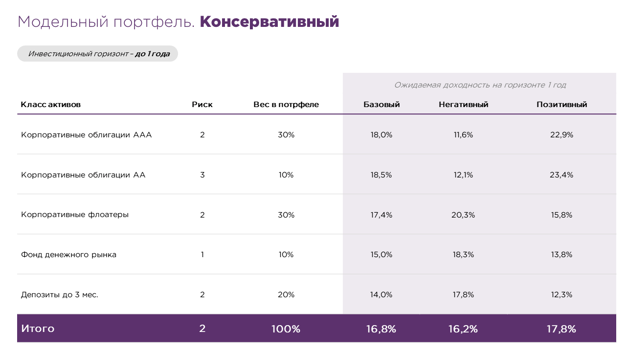 Основу консервативного портфеля составляют корпоративные облигации с фиксированным купоном высокого кредитного качества (AAA и AA), что позволяет зафиксировать текущие высокие уровни доходности. Для защиты от процентного риска и поддержания стабильного денежного потока в портфель включены корпоративные облигации с плавающим купоном (флоатеров) высококачественных эмитентов рейтинга AAA, обеспечивающих премию к ключевой ставке. Дополнительная ликвидность обеспечивается через фонды денежного рынка и краткосрочные депозиты. Такой состав портфеля в условиях высоких процентных ставок позволит на краткосрочном горизонте (до 1 года) эффективно сочетать высокую доходность с низким уровнем риска, обеспечивая при этом необходимую гибкость портфеля и возможность своевременно реагировать на рыночные вызовы.