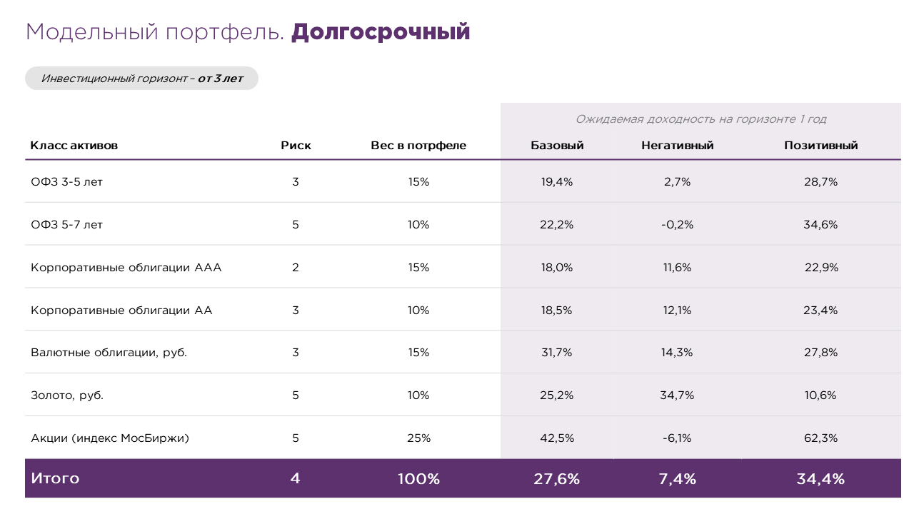 Долгосрочный портфель (горизонт >3 лет) нацелен на существенный прирост капитала и подразумевает готовность инвестора к краткосрочным колебаниям рынка для достижения потенциально более высокой доходности. Акции, составляющие 25% структуры портфеля, являются источником долгосрочного роста капитала, который позволяет участвовать в экономическом развитии и росте корпоративных доходов, а также служит защитой от инфляции в долгосрочной перспективе. Существенная часть портфеля также сосредоточена в облигациях федерального займа и корпоративных выпусках, которые обеспечивают предсказуемый купонный доход и снижают общую волатильность портфеля. Золото и валютные облигации выполняют функцию хеджирования валютных рисков и защиты в периоды экономической нестабильности.