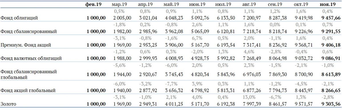 В качестве эксперимента мы решили рассмотреть, как сложилась бы ситуация с инвестиционным портфелем клиента при инвестировании по одной тысяче рублей каждый месяц на протяжении девяти месяцев 2019 года в открытые паевые инвестиционные фонды рыночных финансовых инструментов, находящиеся под управлением ТКБ Инвестмент Партнерс (АО). Данные в приведенной ниже таблице носят информационный характер и рассчитаны на основе официальной отчетности фондов по приросту стоимости инвестиционного пая за соответствующие периоды без учета надбавок к расчетной стоимости инвестиционных паев при их выдаче и скидок с расчетной стоимости инвестиционных паев при их погашении, предусмотренных правилами доверительного управления паевыми инвестиционными фондами.