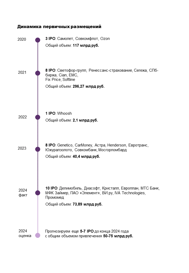 Катализаторами роста первичных размещений на бирже стали закрытие иностранных рынков капитала, а также ликвидность, возникшая ввиду прихода большого количества розничных инвесторов. Динамика первичных размещений более чем положительная, по прогнозам аналитиков ТКБ Инвестмент Партнерс (АО) может достигнуть 123-149 млрд руб. по итогам 2024 г.