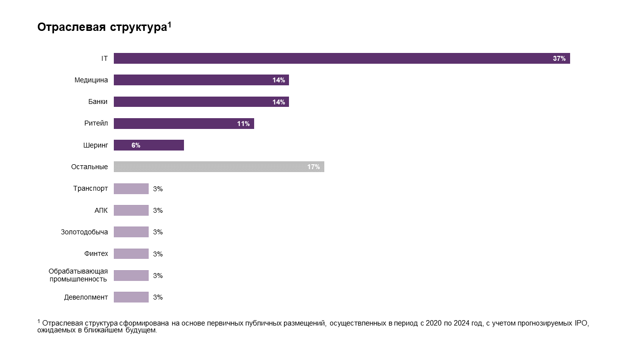 Наряду с хорошо известными на рынке компаниями, осуществившими IPO на горизонте 2020 – 2024 г., появляются и новые имена в списке Московской биржи. Отраслевая структура на текущий момент выглядит следующим образом: