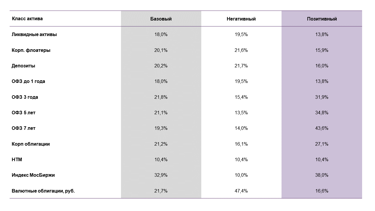 И. К.: «Принцип контрциклического подхода прост — не будь с толпой, потому что толпа часто ошибается. Практически всегда ошибается. Также нужно соизмерять, выбирать верное соотношение риск-доходность. У нас всегда есть базовый, негативный и позитивный сценарий развития ситуации на рынке. Сейчас вероятности расставлены примерно следующим образом: 60% — базовый сценарий, 30% оставляем на негативный, 10% отводится на позитивный. Так процентное значение для каждого из сценариев следует умножить на вероятность, сложить и получить реалистичную доходность, которую можно ожидать в будущем». Это позволяет оценить риск на уровне ожидаемой доходности портфеля при избранном позиционировании по классам активов.