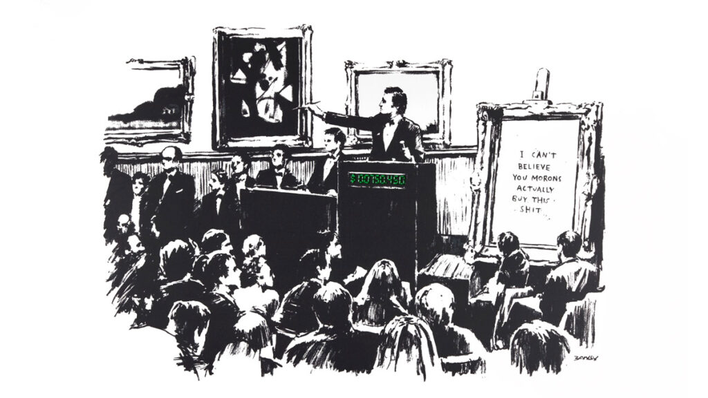 Стоит отметить, что на сожженном трафарете Бэнкси изображен аукцион. Его участники страстно желают заполучить картину с надписью I canʼt believe you morons actually buy this shit — «Не могу поверить, что вы, дебилы, действительно покупаете это дерьмо».