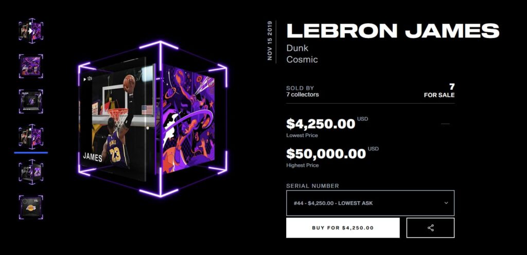 - NFT-платформа NBA Top Shot, в рамках которой любители баскетбола коллекционируют и обмениваются избранными моментами с матчей (в формате коротких видеороликов). С 2019 по 2021 годы объем продаж NBA Top Shot превысил 230 млн долларов. За NFT-хайлайты с одним из самых популярных игроков NBA Джеймсом Леброном в начале апреля 2021 года просят от 95 до 250 тыс. долларов.