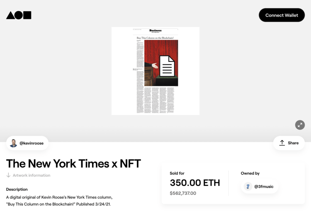- «Владеть кусочком истории — вот самая большая привилегия. Впервые за 170-летнюю историю The New York Times публикация будет распространятся как уникальный токен. Если эта технология действительно настолько революционная, как говорят ее фанаты, то владение данной публикацией равносильно владению первой телевизионной трансляцией NBC», — написал колумнист NYT Кевин Рус. NFT с электронной версией публикации под названием «Купи эту колонку на блокчейне!» приобрели за 350 эфира или примерно за 900 тыс. долларов по текущему курсу.