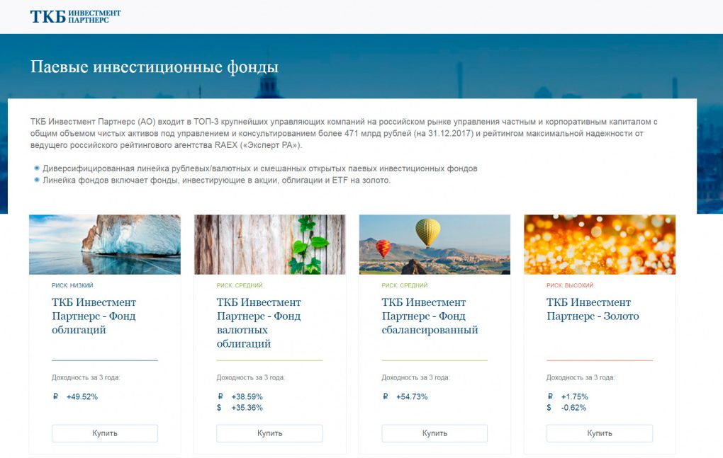 ОПИФ рыночных финансовых инструментов «ТКБ Инвестмент Партнерс – Фонд облигаций» (Правила доверительного управления фондом зарегистрированы ФКЦБ России 24.12.2002 г. за № 0081-58233855; прирост стоимости пая на 28.02.2025: за 1 мес.: -0.43%, за 3 мес.: 5.17%, за 6 мес.: 3.48%, за 1 г.: -1.05%, за 3 г.: -, за 5 л.: 24.99%); ОПИФ рыночных финансовых инструментов «ТКБ Инвестмент Партнерс – Фонд сбалансированный» (Правила доверительного управления фондом зарегистрированы ФКЦБ России 24.12.2002 г. за № 0078-58234010; прирост стоимости пая на 28.02.2025: за 1 мес.: 7.41%, за 3 мес.: 24.64%, за 6 мес.: 19.38%, за 1 г.: -0.20%, за 3 г.: -, за 5 л.: 62.91%); ОПИФ рыночных финансовых инструментов «ТКБ Инвестмент Партнерс – Премиум. Фонд акций» (Правила доверительного управления фондом зарегистрированы ФСФР России 28.02.2006 г. за № 0478-75408434; прирост стоимости пая на 28.02.2025: за 1 мес.: 9.17%, за 3 мес.:30.86%, за 6 мес.: 22.32%, за 1 г.: 0.47%, за 3 г.: -, за 5 л.: 75.24%); ОПИФ рыночных финансовых инструментов «ТКБ Инвестмент Партнерс – Фонд валютных облигаций» (Правила доверительного управления фондом зарегистрированы ФСФР России 20.09.2007 г. за № 0991-94131990; прирост стоимости пая на 28.02.2025: за 1 мес.: -6.39%, за 3 мес.: -8.67%, за 6 мес.: 10.38%, за 1 г.: 3.89%, за 3 г.: -, за 5 л.: 0.59%); ОПИФ рыночных финансовых инструментов «ТКБ Инвестмент Партнерс – Золото» (Правила доверительного управления фондом зарегистрированы ФСФР России 28.12.2010 г. за № 2026-94198244; прирост стоимости пая на 28.02.2025: за 1 мес.: -7.07%, за 3 мес.: -7.06%, за 6 мес.: 12.80%, за 1 г.: 34.10%, за 3 г.: -, за 5 л.: 104.98%); ОПИФ рыночных финансовых инструментов «ТКБ Инвестмент Партнерс – Фонд сбалансированный с выплатой дохода» (Правила доверительного управления фондом зарегистрированы ФКЦБ России 21.03.2003 г. за № 0096-58227323; прирост стоимости пая на 28.02.2025: за 1 мес.: 2.54%, за 3 мес.: 17.00%, за 6 мес.: 21.56%, за 1 г.: -, за 3 г.: -93.46%, за 5 л.: -86.79%); ОПИФ рыночных финансовых инструментов «ТКБ Инвестмент Партнерс – Перспектива» (Правила доверительного управления зарегистрированы ФСФР России 16.06.2004 г. за № 0219-14281681; прирост стоимости пая на 28.02.2025: за 1 мес.: 3.29%, за 3 мес.: 18.34%, за 6 мес.: 126.63%, за 1 г.: -, за 3 г.: -, за 5 л.: 4.87%); ЗПИФ акций «Системные инвестиции» (Правила доверительного управления фондом зарегистрированы ФСФР России 15.06.2011 г. за № 2154-94173824); ЗПИФ недвижимости «Межрегиональный фонд недвижимости» (Инвестиционные паи фонда предназначены для квалифицированных инвесторов); ЗПИФ финансовых инструментов «ТКБ Инвестмент Партнерс – Хеджевый фонд» (Инвестиционные паи фонда предназначены для квалифицированных инвесторов); ЗПИФ недвижимости «Нева Хаус» (Правила доверительного управления зарегистрированы Банком России 02.11.2017 г. за № 3414); ЗПИФ акций «Альтернативные инвестиции» (Правила доверительного управления зарегистрированы ФСФР России 05.08.2010 г. за № 1866-94169001); ЗПИФ рыночных финансовых инструментов «Заблокированные активы паевого инвестиционного фонда «ТКБ Инвестмент Партнерс – Фонд валютных облигаций»» (Правила доверительного управления зарегистрированы Банком России 26.12.2023 за № 5947); ЗПИФ рыночных финансовых инструментов «Заблокированные активы паевого инвестиционного фонда «ТКБ Инвестмент Партнерс – Фонд акций глобальный»» (Правила доверительного управления зарегистрированы Банком России 26.12.2023 за № 5949); ЗПИФ рыночных финансовых инструментов «Заблокированные активы паевого инвестиционного фонда «ТКБ Инвестмент Партнерс – Фонд акций глобальный 2» (Правила доверительного упр