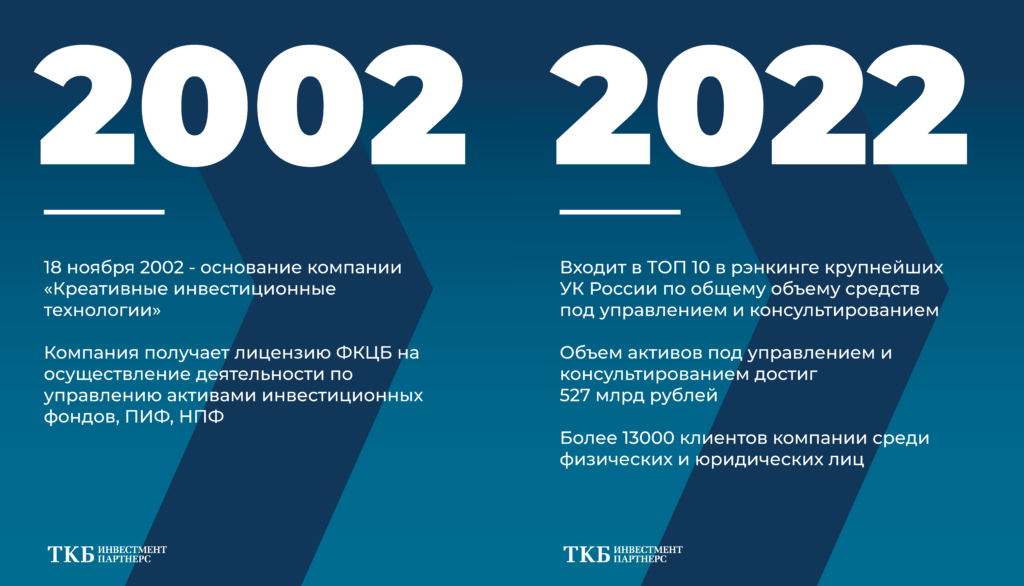 Управляющая компания прошла долгий и уникальный путь, который начался в далеком 2002 году. Сейчас ТКБ Инвестмент Партнерс занимает лидирующие позиции на рынке, являясь одной из крупнейших управляющих компаний России.